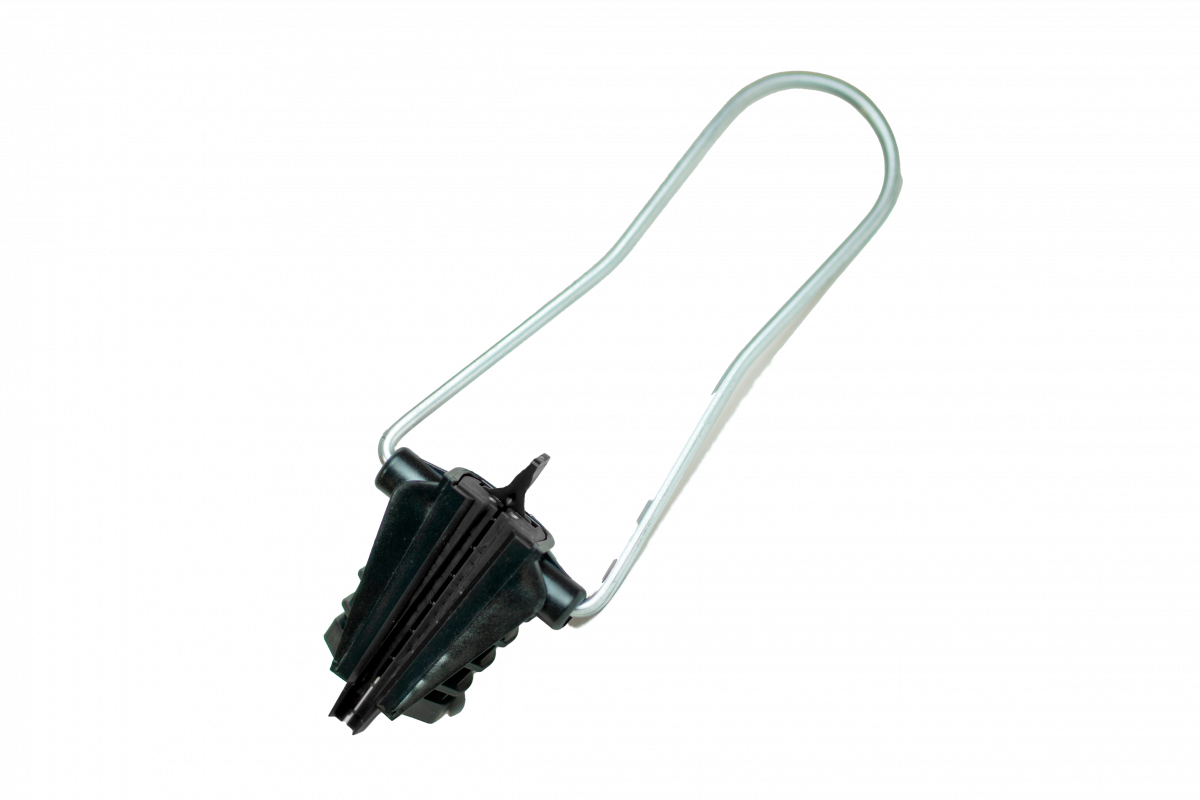 Зажим состоит из полимерного корпуса со стальной оцинкованной петлей и двух полимерных клиньев, устойчивых к морозам.